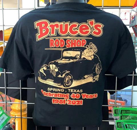 FULL SIZE DESIGN ON THE BACK, SMALL SHOP LOGO ON LEFT CHEST.